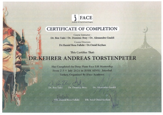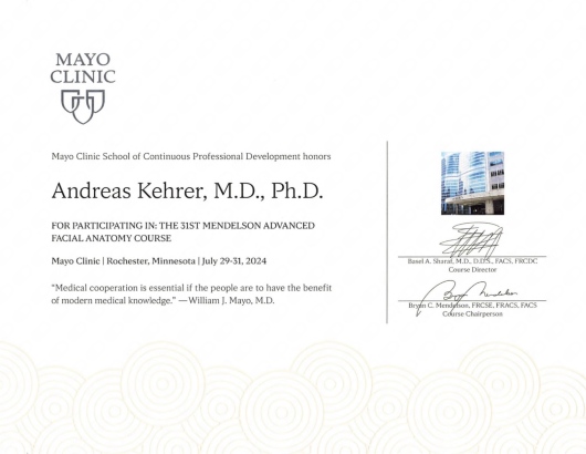 Ich konnte mein Wissen durch mehrere internationale Fellowships vertiefen – unter anderem in Großbritannien (London), den Niederlanden, Taiwan und Südkorea – bei weltweit anerkannten Spezialisten der rekonstruktiven und ästhetischen Gesichtschirurgie. Ergänzend zu diesen mehrmonatigen Fellowships habe ich zahlreiche internationale Hospitationen an Zentren mit weltweitem Renommee absolviert. Besonders am Herzen liegt mir die Verbindung aus chirurgischer Präzision, wissenschaftlich fundierten Techniken und einem individuellen ästhetischen Gespür für jedes einzelne Gesicht. Über Jahre hinweg habe ich außerdem eigene anatomische Studien zur Gesichtsmuskulatur, Gesichtsnerven und den sicheren Facelift-Präparationsebenen durchgeführt, die direkt in meine Arbeit einfließen. Regelmäßige Hospitationen in weltweit führenden Zentren der Gesichtsästhetik – beispielsweise in Beverly Hills und Los Angeles, USA (2017, 2019, 2022, 2023, 2025) sowie die Teilnahme an mehreren internationalen Fachkongressen und Kursen jedes Jahr (z.B. MAFAC-Facelift-Kurs Mayo Clinic USA 2024, IFACE Facelift-Kurs, Istanbul 2024)– sichern, dass Ihre Behandlung stets am Puls der Zeit erfolgt und nach den modernsten sowie effektivsten Techniken durchgeführt wird.