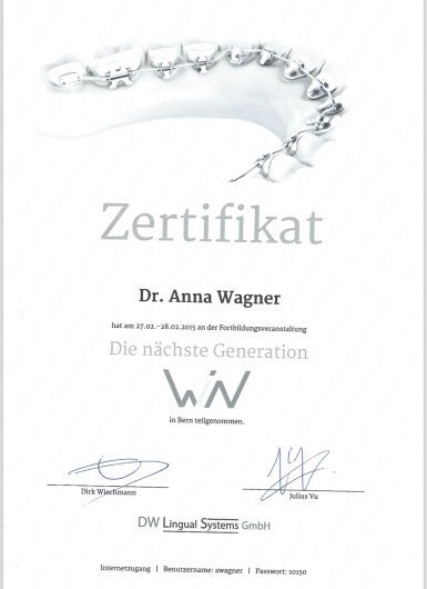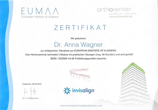 Welche Fachgebiete deckt Dr. Anna Wagner ab?Dr. Anna Wagner ist Kieferorthopädin. Wir zeigen Ihnen einige Behandlungsschwerpunkte, mit denen Dr. Anna Wagner besonders viel Erfahrung hat: Allgemeine Sprechstunde, Unsichtbare Zahnspange (Beratung), Allgemeine Beratung, feste Zahnspange, Invisalign, Invisalign (Beratung), Invisalign einsetzen, Invisalign Kontrolle, Kieferorthopädie (Beratung), Kiefergelenksbehandlung (CMD).