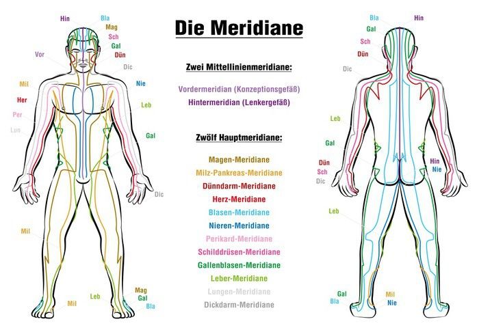Die allgemeine Theorie der Akupunktur ist, dass die richtige physiologische Funktion und Gesundheit von der Zirkulation von Nährstoffen, Substanzen und Energie namens Qi durch ein Netzwerk von "Kanälen" oder "Meridianen" abhängt. Dieses Netzwerk verbindet jedes Organ und jeden Teil des Körpers, des