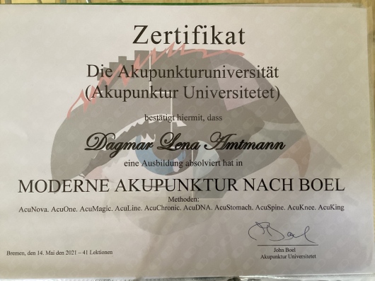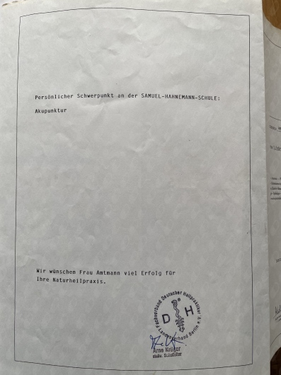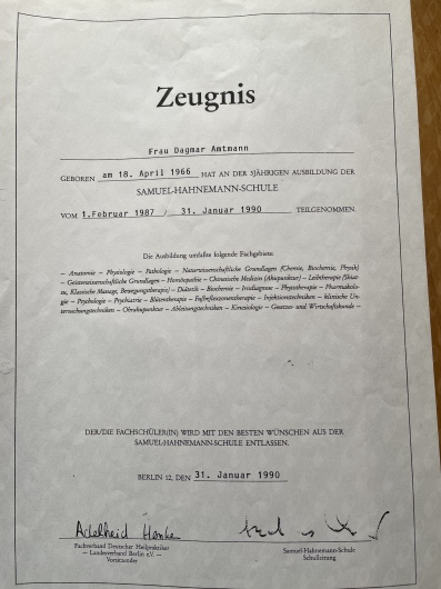 Heilpraktikerin seit 1991Ich bin seit 1991 Heilpraktikerin mit dem Schwerpunkt Akupunktur und Pflanzenheilkunde und übe meinen Beruf nach wie vor mit Leidenschaft aus. Aus diesem Grund habe ich mitlerweile neben der Akupunktur ein weitreichendes Therapiespektrum und sehr viel Erfahrung. Sehr gerne möchte ich mit dieser Erfahrung für Sie und Ihre Beschwerden da sein.