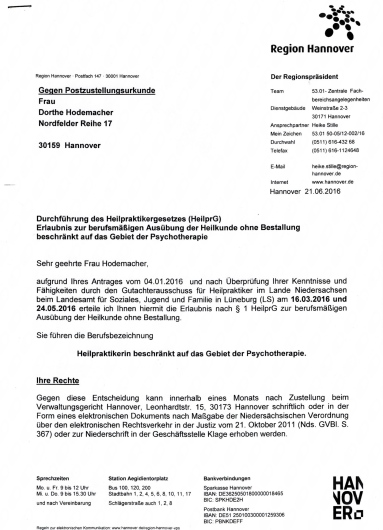 - Heilpraktikerin beschränkt auf das Gebiet der Psychotherapie (Gesundheitsamt Hannover)