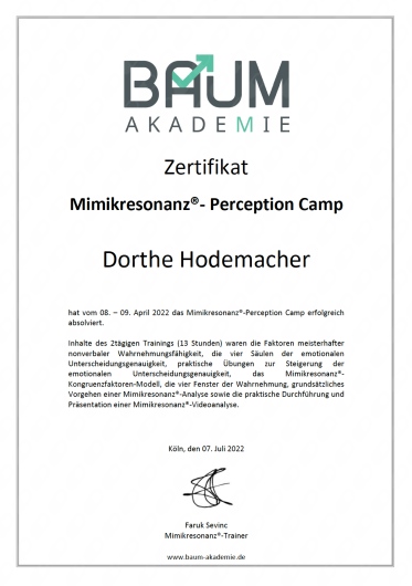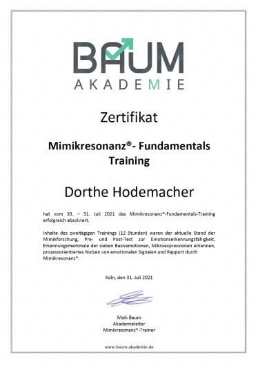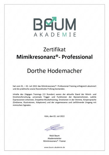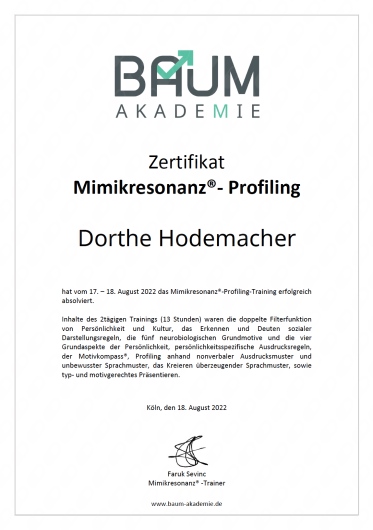 Welche Sprachen spricht M.A. Dorthe Hodemacher?Sie können sich mit M.A. Dorthe Hodemacher auf Deutsch (Deutsch), Englisch (English) unterhalten.