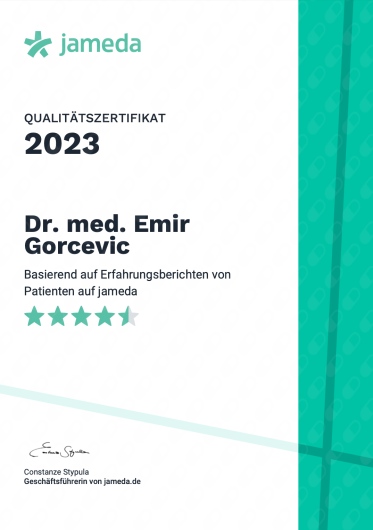 Wann kann ich einen Termin bei Dr. med. Emir Gorcevic wahrnehmen?Im Moment hat Dr. med. Emir Gorcevic keine freien Termine, da der Terminkalender der Praxis für die kommenden Wochen ausgebucht ist. Wir empfehlen Ihnen, Dr. med. Emir Gorcevic zu kontaktieren, falls ein Termin frei wird oder Sie einen Termin für einen späteren Zeitpunkt vereinbaren möchten.