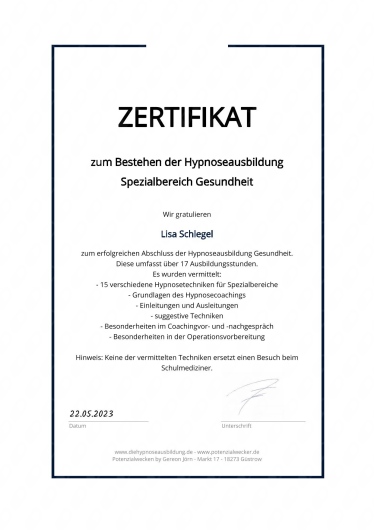 Zudem kann Hypnose dazu dienen, den seelischen Anteil körperlicher Beschwerden zu unterstützen. So kann Hypnose möglicherweise bei Schmerzen, einem Schmerzgedächtnis, bei Verspannungen und Krämpfen, bei der Stärkung deines Immunsystems oder zur Steigerung des allgemeinen Wohlbefindens unterstützen. Dies ersetzt nicht den Besuch eines Allgemeinmediziners oder Facharztes, sondern kann möglicherweise den seelischen Krankheitsanteil beeinflussen.