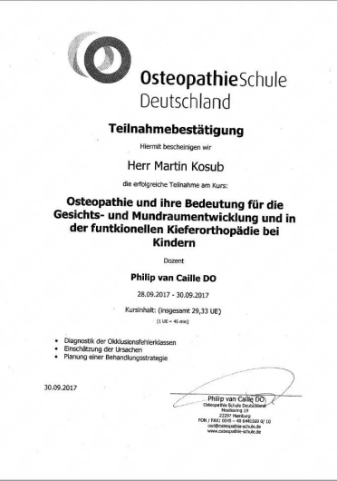 Welche Fachgebiete deckt Dr. med. Martin Kosub ab?Dr. med. Martin Kosub ist Orthopäde & Unfallchirurg, Sportmediziner, Chirotherapeut. Wir zeigen Ihnen einige Behandlungsschwerpunkte, mit denen Dr. med. Martin Kosub besonders viel Erfahrung hat: Stoßwellentherapie, Sportmedizinische Untersuchung, Osteopathie, Akupunktur, Kinderosteopathie, Naturheilkunde, Chirotherapie.