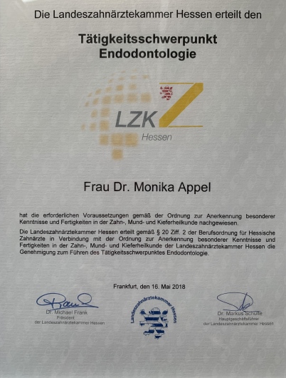 Als Zahnärztin habe ich mich kontinuierlich weitergebildet und zahlreiche Fortbildungen in den Bereichen Zahnerhaltung, ästhetische Zahnheilkunde, Kinderbehandlung und Endodontologie absolviert. Besonders hervorzuheben ist mein Curriculum Endodontologie, das ich 2018 bei der Landeszahnärztekammer Hessen abgeschlossen habe