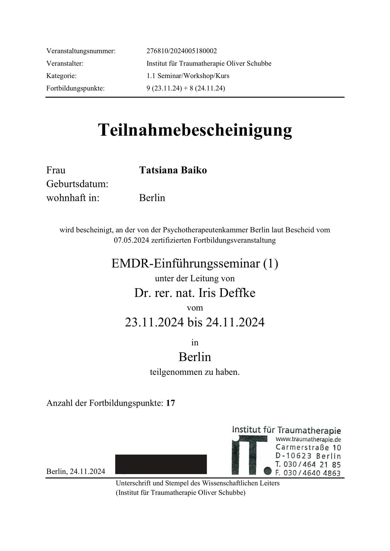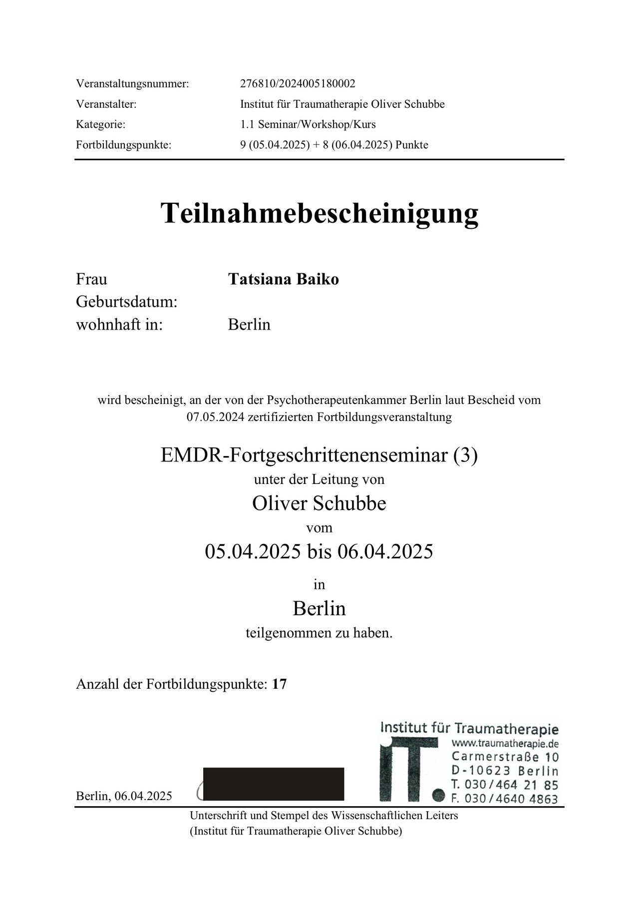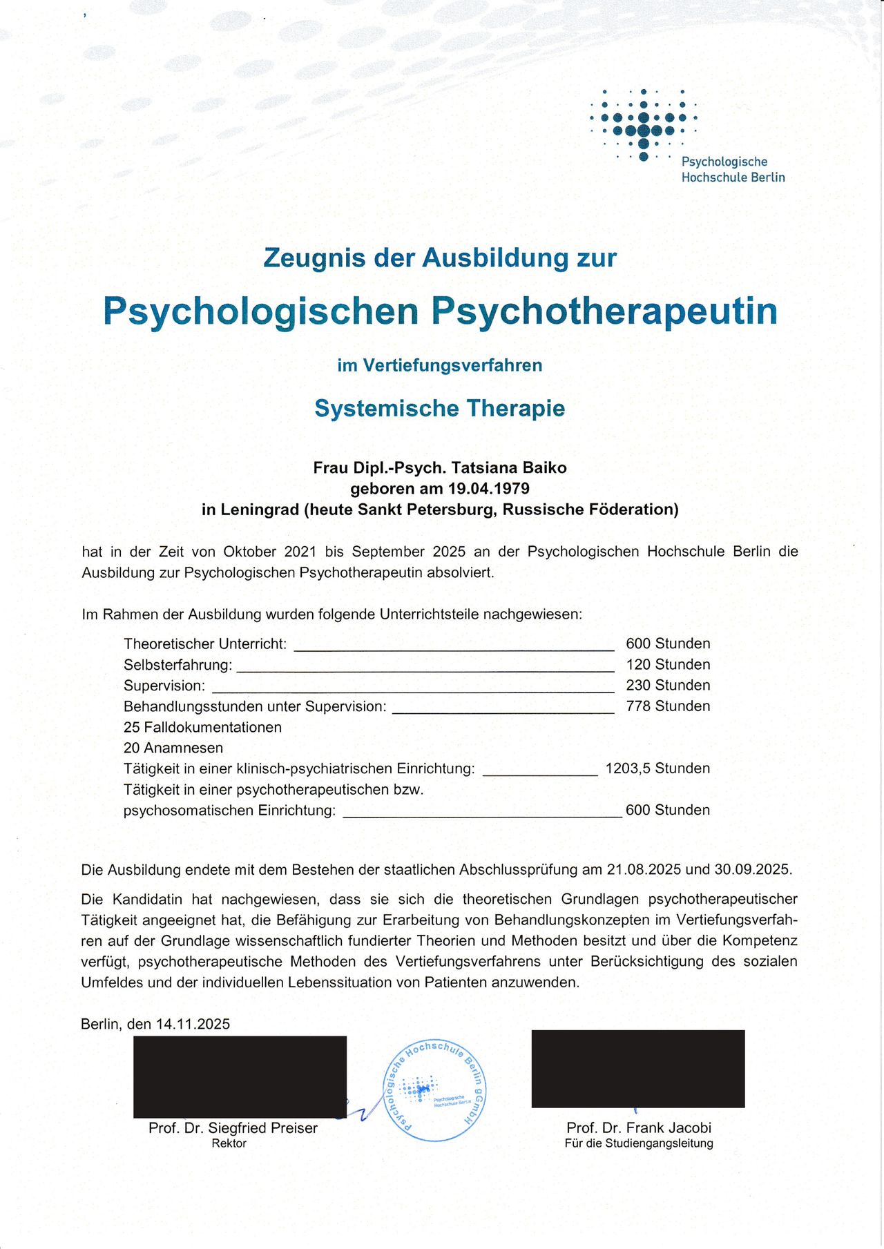 Privatpraxis Tatsiana Baiko Psycholog. Psychotherapeutin