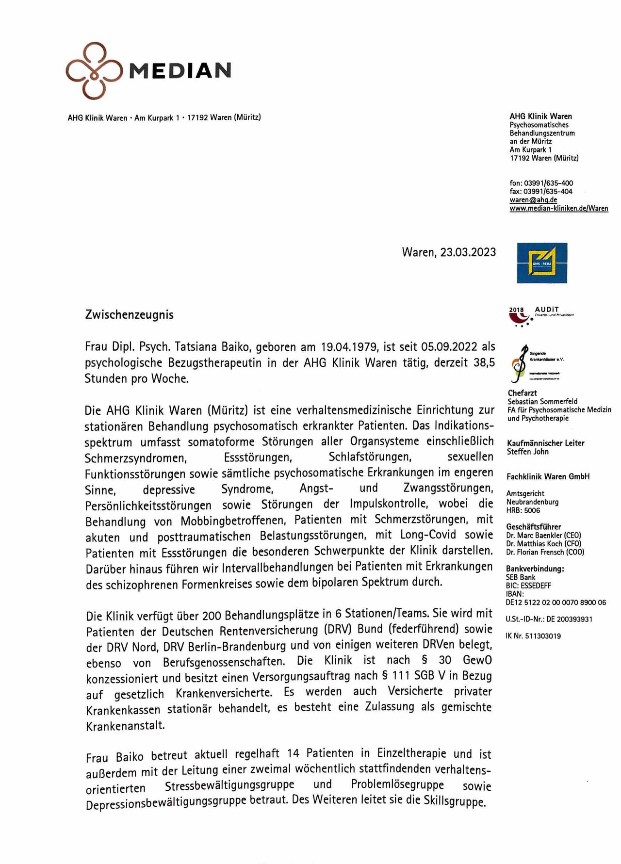Welche Erfahrungen haben Patient:innen mit Dipl.-Psych. Tatsiana Baiko gemacht?Insgesamt 4 Patient:innen haben ein Feedback zu Dipl.-Psych. Tatsiana Baiko gegeben, mit einem durchschnittlichen Ergebnis von 5 Sternen (von 5).